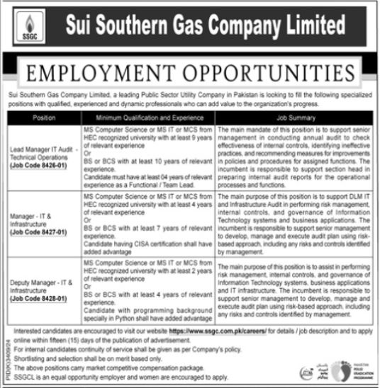 Vacant posts including Manager It Infrastructure, Deputy Manager It Infrastructure and Lead Manager It Audit are announced in Sui Southern Gas Company Limited SSGC Karachi, karachi Sindh Pakistan as per 12 May 2025 advertisement in daily Roznama 92 News Newspaper. Bachelor, Master and MS etc. educational qualification will be preferred.