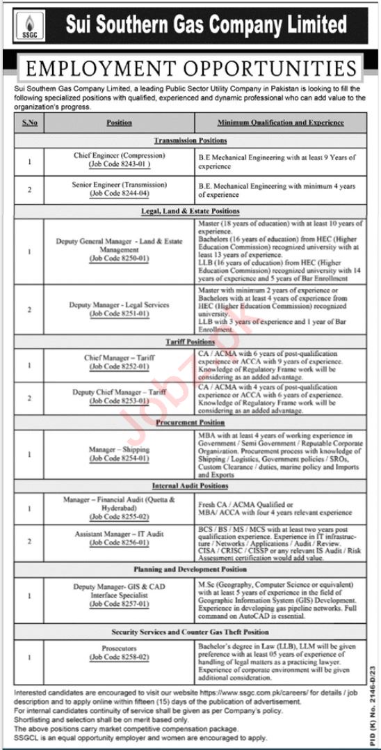 Sui Southern Gas Company Limited SSGC jobs advertisement dated about 28 January 2024 in daily Jang Newspaper invites application for the vacant post of Engineer Transmission, Manager Financial Audit, Deputy General Manager Land Estate Management, Chief Manager Tariff, Deputy Chief Manager Tariff, Chief Engineer Compression, Prosecutor, Manager Shipping, Deputy Manager Gis Cad Interface Specialist, Deputy Manager Legal Services and Assistant Manager It Audit in Lahore, lahore Punjab Pakistan. Educational qualifications required CA, MBA, Bachelor, M.sc, B.E, LLb and Master etc.
