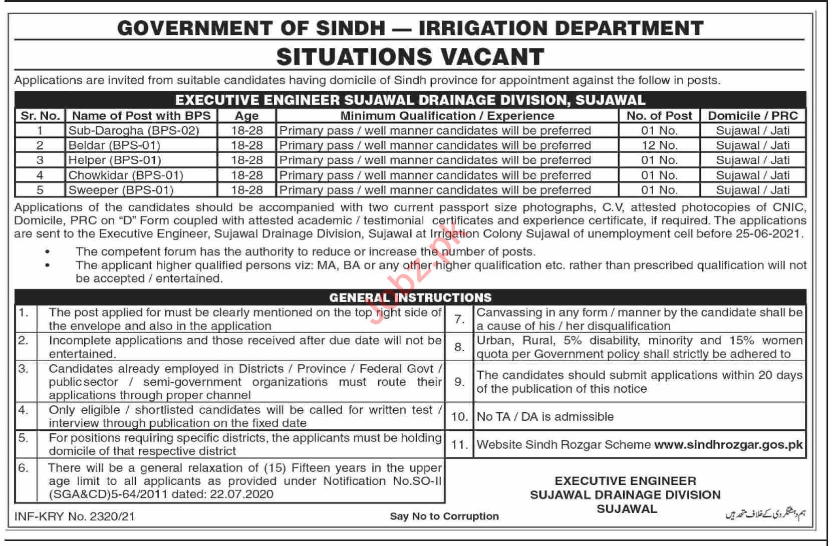Sujawal Drainage Division Irrigation Department Jobs 2021