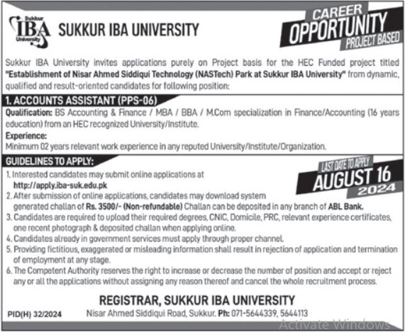 Sukkur IBA University jobs advertisement dated about 29 July 2024 in daily Khabrain Newspaper invites application for the vacant post of accounts assistant in Sukkur, sukkur Sindh Pakistan. Bachelor etc. educational qualification will be preferred.