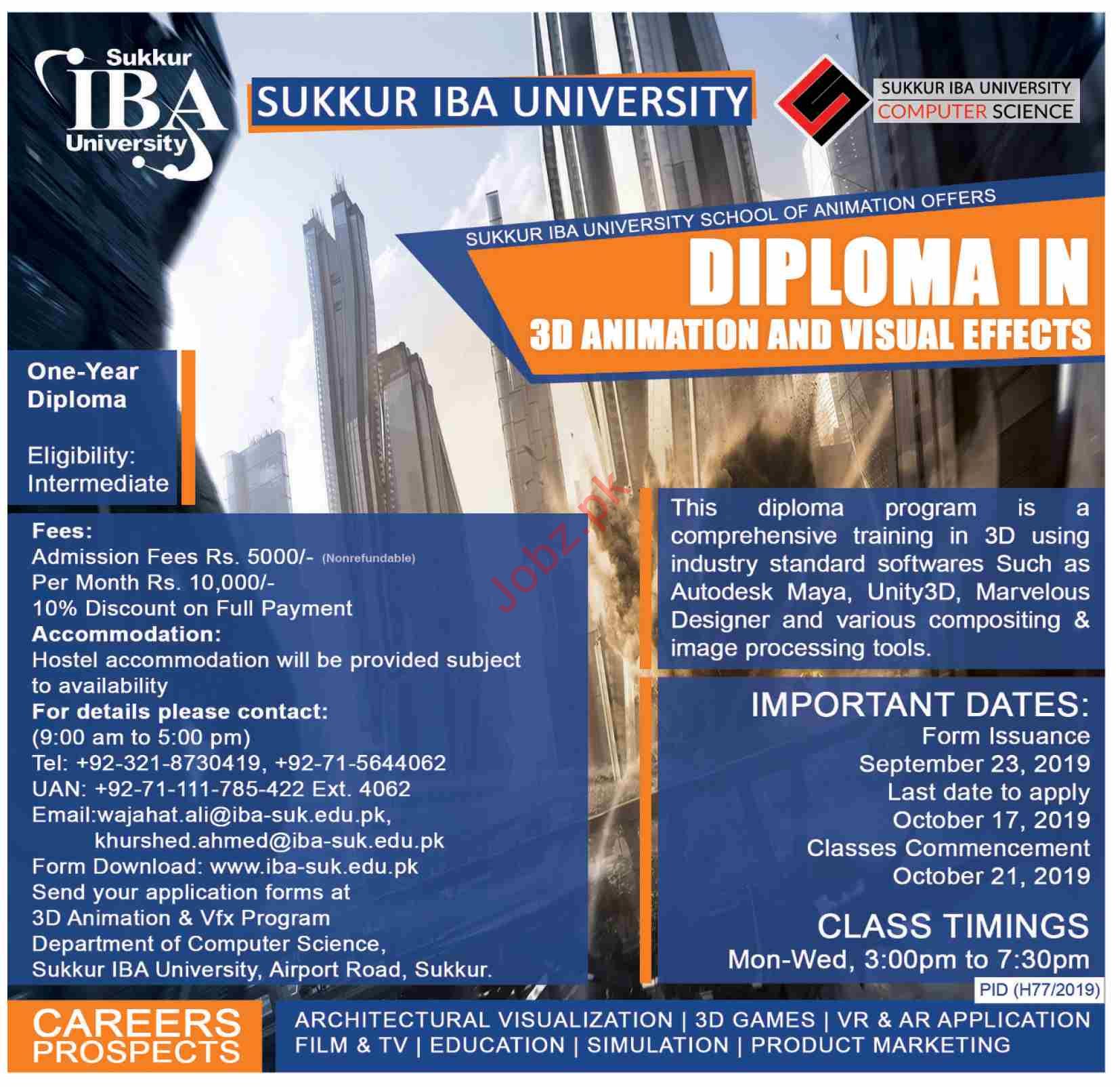 Sukkur IBA University School of animation offers admission in Diploma in 3D Animation and Visual Effects in Sukkur IBA University, Sukkur. Last date to apply is October 21, 2019. Read newspaper ad for exact details.