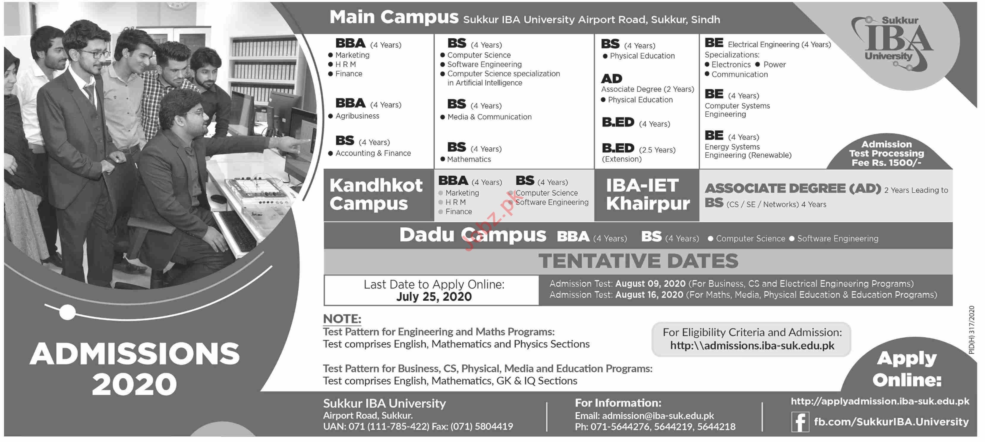 Sukkur IBA University, Pakistan is opening admissions fall 2020 for the classes of BBA, AD, BS, B Ed, BE in Electronics, Power, Energy Systems & Communication. Read newspaper ad for exact details.