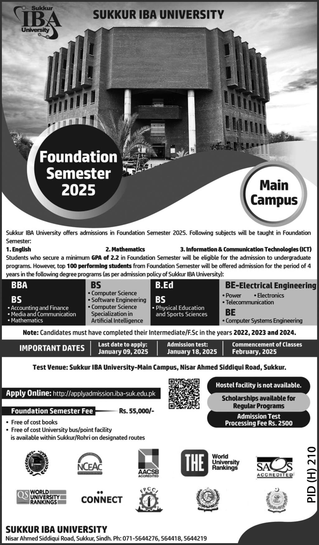 Sukkur IBA University admissions 2024 for Accounting & Finance, Media & Communication, Computer Science, Software Engineering, Artificial Intelligence, Computer Systems Engineering has been announced. Eligible students can apply for academic admissions 2024 in Sukkur IBA University Sukkur Sindh Pakistan for Teaching University. Students who want to enroll for academic session 2024 in B.E, BBA, BS and B.ed qualification and admission criteria for Government institute can apply till last date 9 January 2025. Read newspaper ad for exact details.