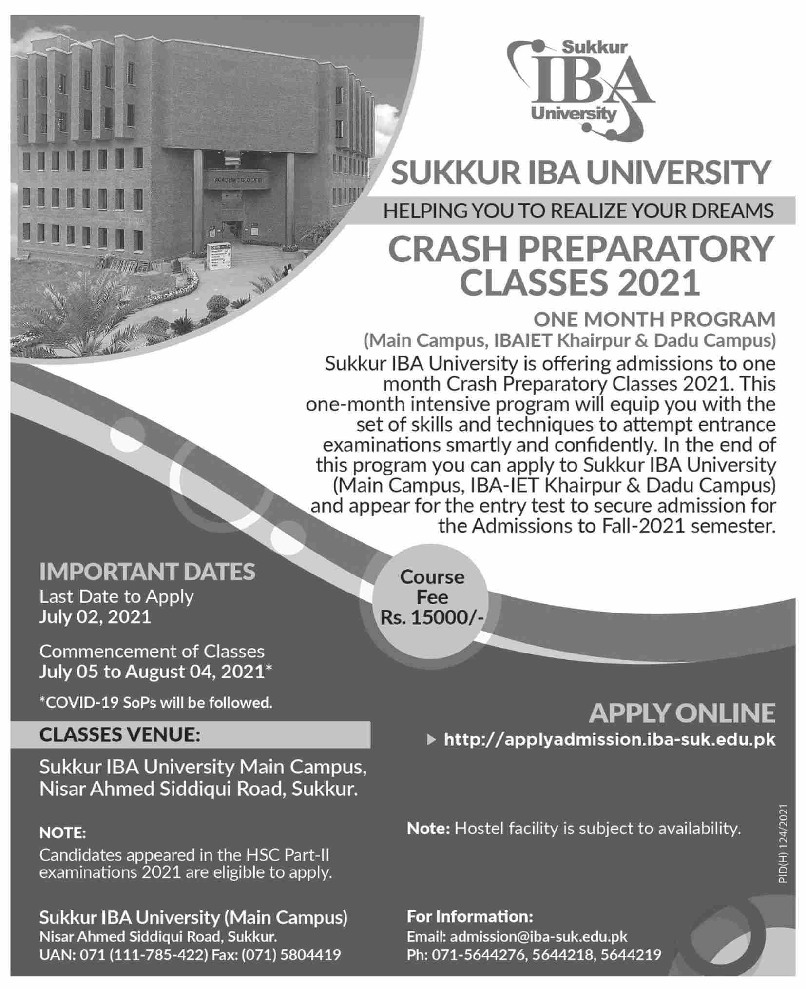 Sukkur IBA University is a public sector degree-awarding institute chartered by the Government of Sindh and recognized by the Higher Education Commission is offering admissions to one month Crash Preparatory Classes 2021 in Sukkur, Khairpur & Dadu Campuses. Read newspaper ad for exact details.