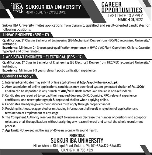 Sukkur IBA University latest Government Engineering jobs and others can be applied till 1 March 2022 or as per closing date in newspaper ad. Read complete ad online to know how to apply on latest Sukkur IBA University job opportunities.