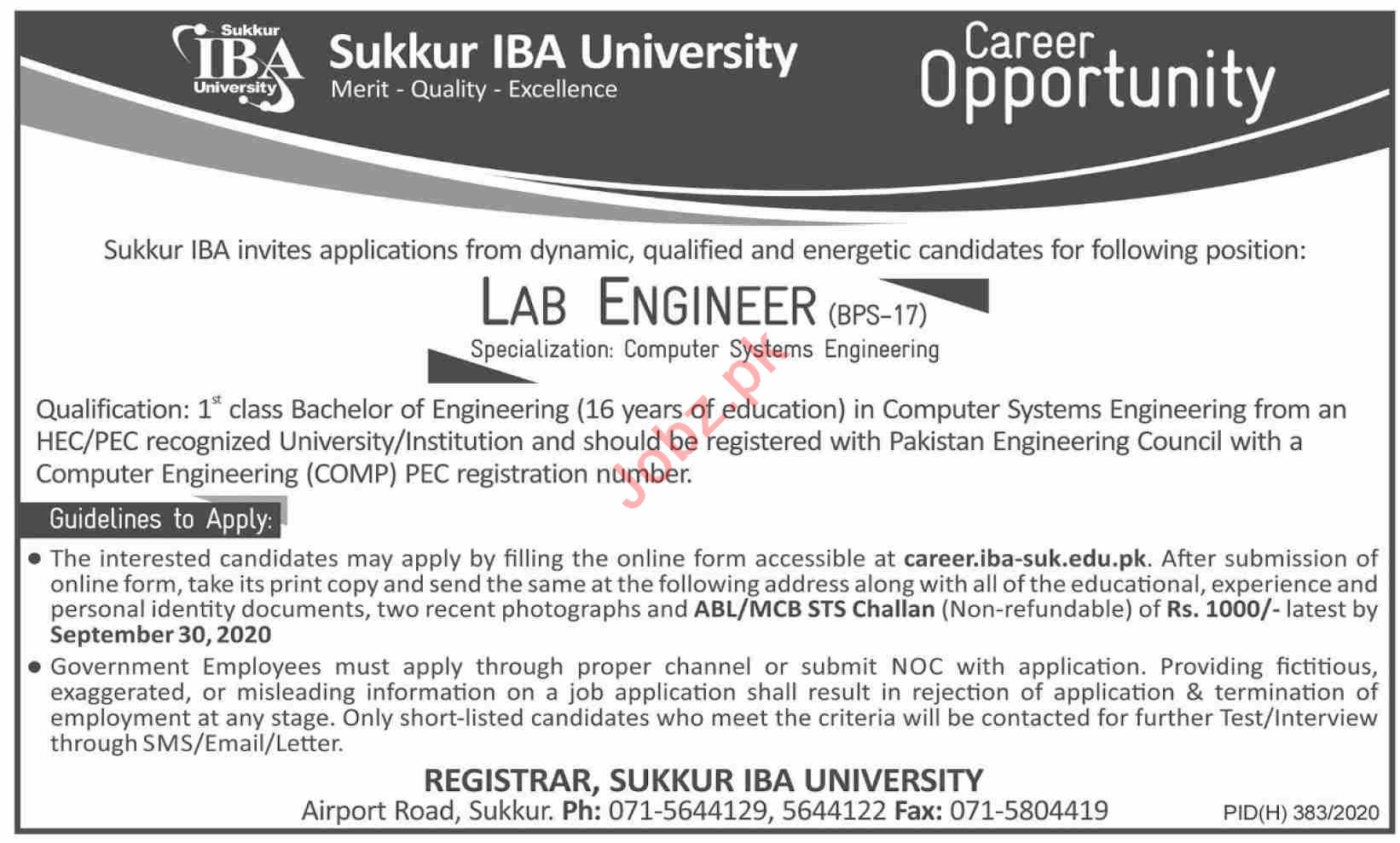 Sukkur IBA University Jobs 2020 For Lab Engineer