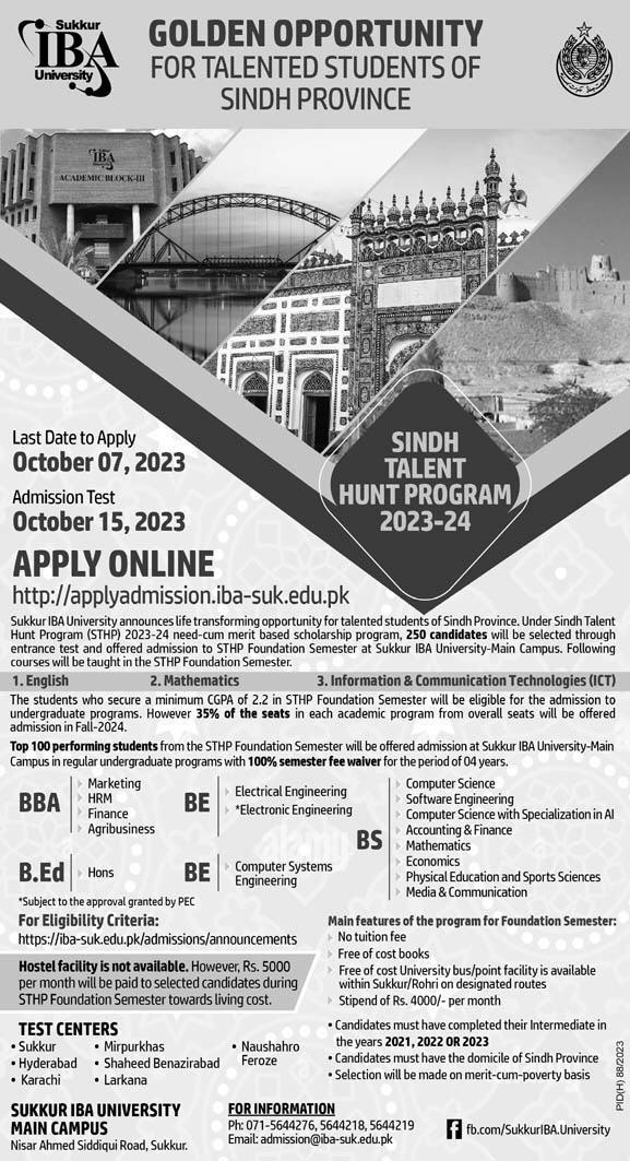Sukkur IBA University admissions 2023 for BBA, BE, BEd, BS degree Program on Sindh Talne Hunt Scholarship has been announced. Students can enroll for admissions in Sukkur IBA University Sukkur Sindh Pakistan for academic year 2023 to continue campus based or online education in Science University. Students for admissions in BS, BBA and B.E & criteria can apply as per Government institute admission policy 2023 before closing date September 18, 2023 as per advertisement. Read newspaper ad for exact details.