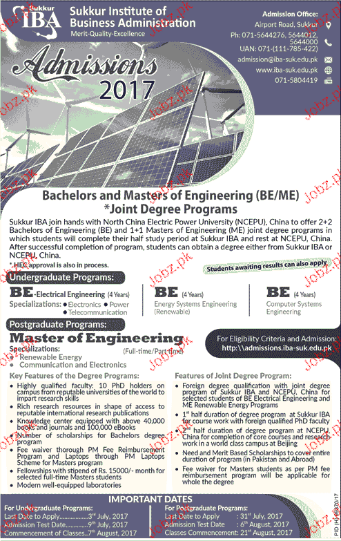 Sukkur Institute of Business Administration Admission in BE in Sukkur. Read newspaper ad for exact details.