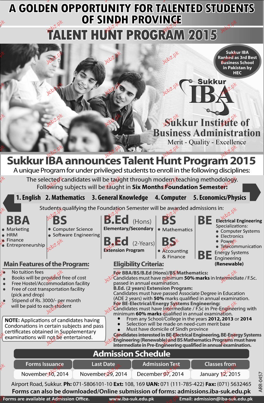 Sukkur Institute of Business Administration Admission in BS, BBA and B.E in Sukkur. Read newspaper ad for exact details.