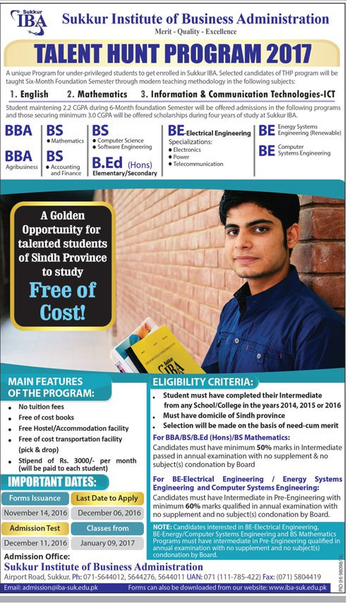 Sukkur Institute of Business Administration Admission in BBA, BS, BE and B.Ed in Sukkur. Read newspaper ad for exact details.