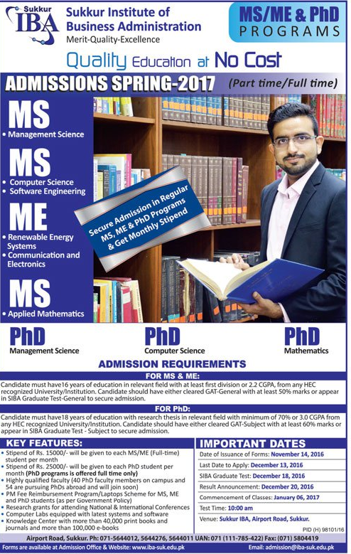 Sukkur Institute of Business Administration Admission in MS and ME in Sukkur. Read newspaper ad for exact details.