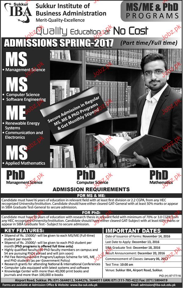 Sukkur Institute of Business Administration Admission in MS and ME in Sukkur. Read newspaper ad for exact details.