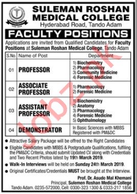 Vacancies in Suleman Roshan Medical College Advertisement March 2019