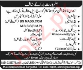 Sundas Foundation Lahore, lahore Punjab Pakistan invites applications from eligible candidates for the post of office boy, administrator, doctor, medical lab technologist, cleaner, tele marketing staff and buildozer manager as per advertisement of October 29, 2023 published in daily Jang Newspaper. Preferred Education is Intermediate, MS, MBBS, Matric, Master and Bachelor etc.