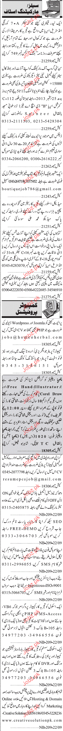 Sunday Jang Classified Computer Professionals and Sales & Marketing Staff are required in Karachi