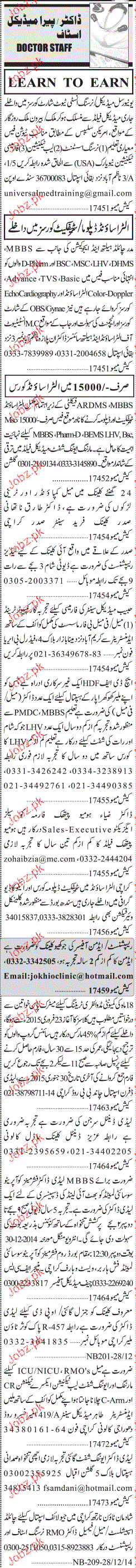 Sunday Jang Classified Doctors and Para Medical Staff are required in Karachi.