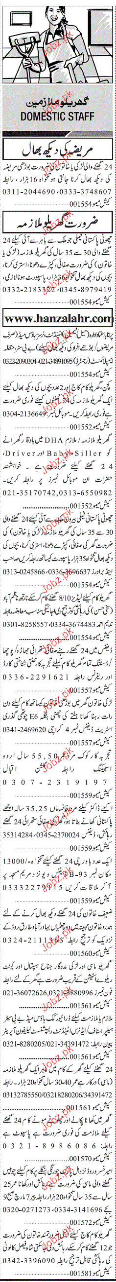 Sunday Jang Classified Domestic Staff are required in Karachi.