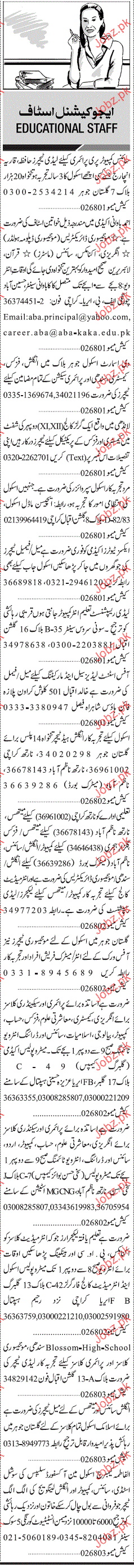 Sunday Jang Classified Educational Staff are required in Karachi.