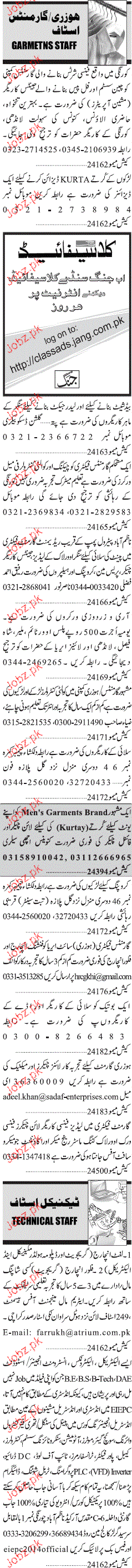 Sunday Jang Classified Hosiery / Garment Staff are required in Karachi.
