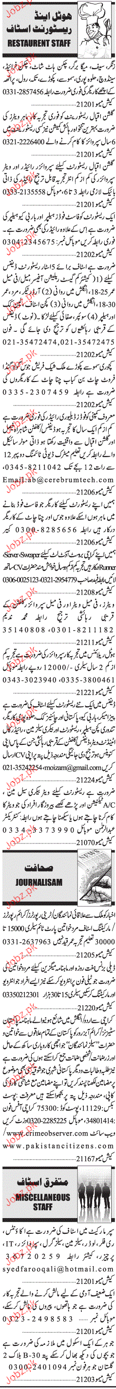 Sunday Jang Classified Hotel and Restaurant Staff are required in Karachi.