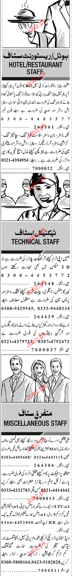 Sunday Jang Classified Hotel and Restaurant Staff Wanted