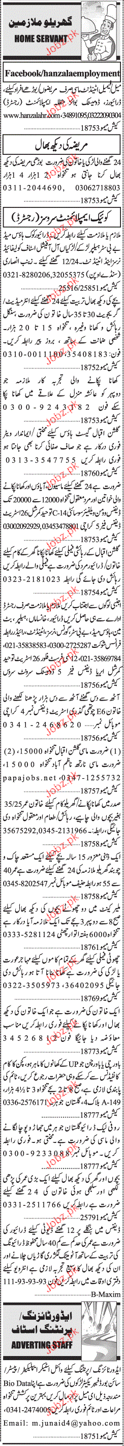 Sunday Jang Classified House Staff Job Opportunity