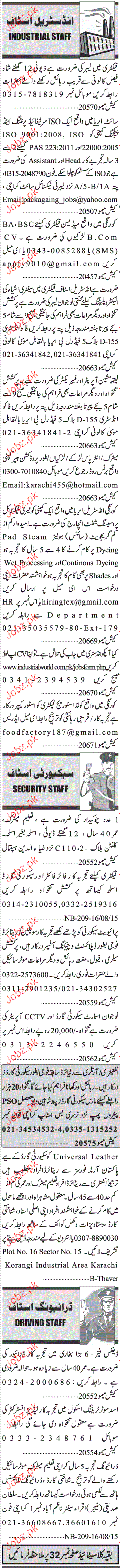 Sunday Jang Classified Industrial Staff are required in Karachi.
