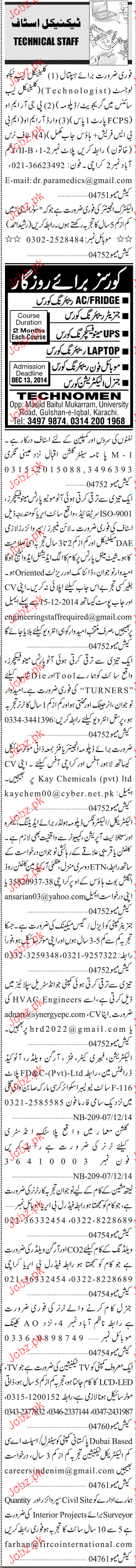 Sunday Jang Classified Technical Staff are required in Karachi.