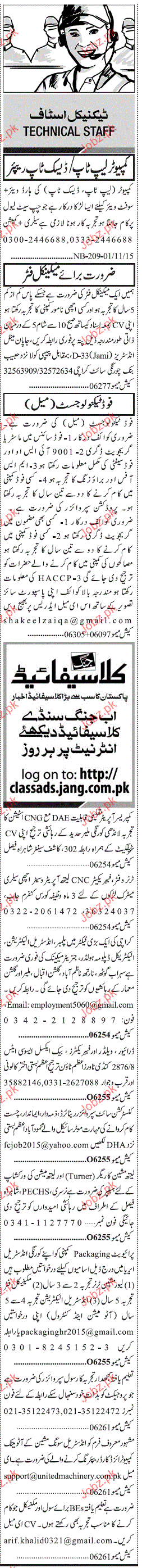 Sunday Jang Classified Technical Staff are required in Karachi.
