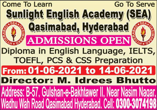 Sunlight English Academy is an education center has announced admissions for diploma in English Language, IELTS, TOEFL, PCS & CSS Preparation in Hyderabad. Read newspaper ad for exact details.