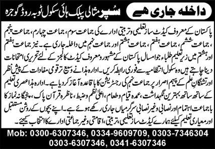 Super Misali Public Middle School invites applications for admissions in Class 3rd, Class 4th, Class 5th, Class 6th, Class 7th, Class 8th and Class 9th in Gojra Punjab Pakistan. Read newspaper ad for exact details.