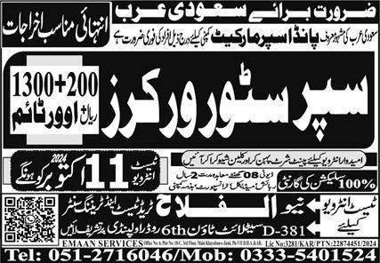 New Al Falah Trade Test & Training Center Riyadh, madina Saudi Arabia invites applications from eligible candidates for the post of super store worker as per advertisement of October 11, 2024 published in daily Express Newspaper. Preferred Education is BA, Bachelor and Intermediate etc.