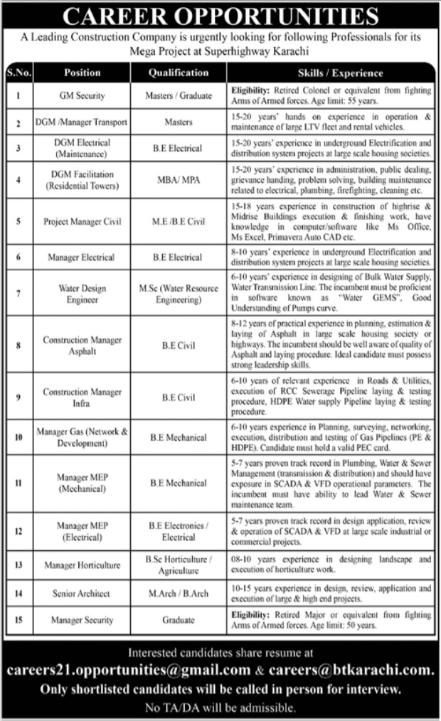 Construction & Engineering Firm Karachi, karachi Sindh Pakistan invites applications from eligible candidates for the post of manager gas, gm security, manager transport, dgm, construction manager, manager electrical, manager security, manager horticulture, project manager civil, architect, dgm facilitation, water design engineer and manager mep mechanical as per advertisement of March 13, 2022 published in daily Jang Newspaper. Candidates with DAE, B.E and Bachelor etc. educational background will be preferred.