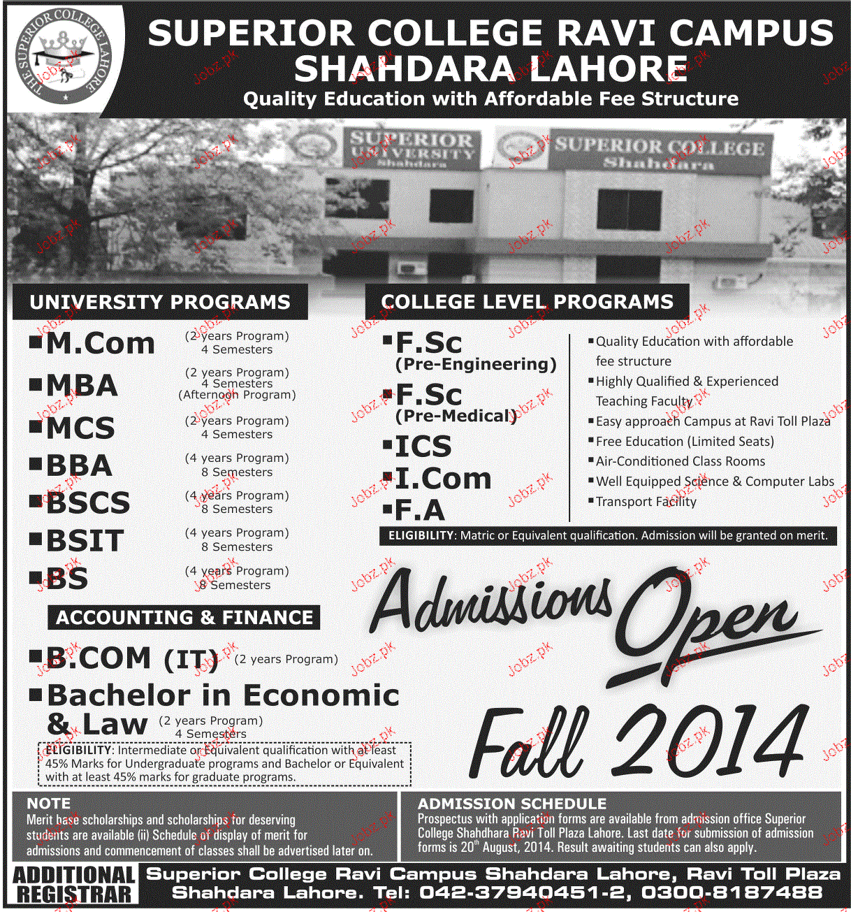 Superior College Admission in M.Com, MBA, MCS, BBA, BSCS, BS, B.Com and B.A Law in Lahore. Read newspaper ad for exact details.