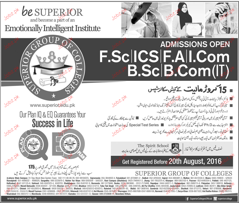 Superior Group of Colleges Admission in Fsc, ICs, FA and I.Com in lahore. Read newspaper ad for exact details.