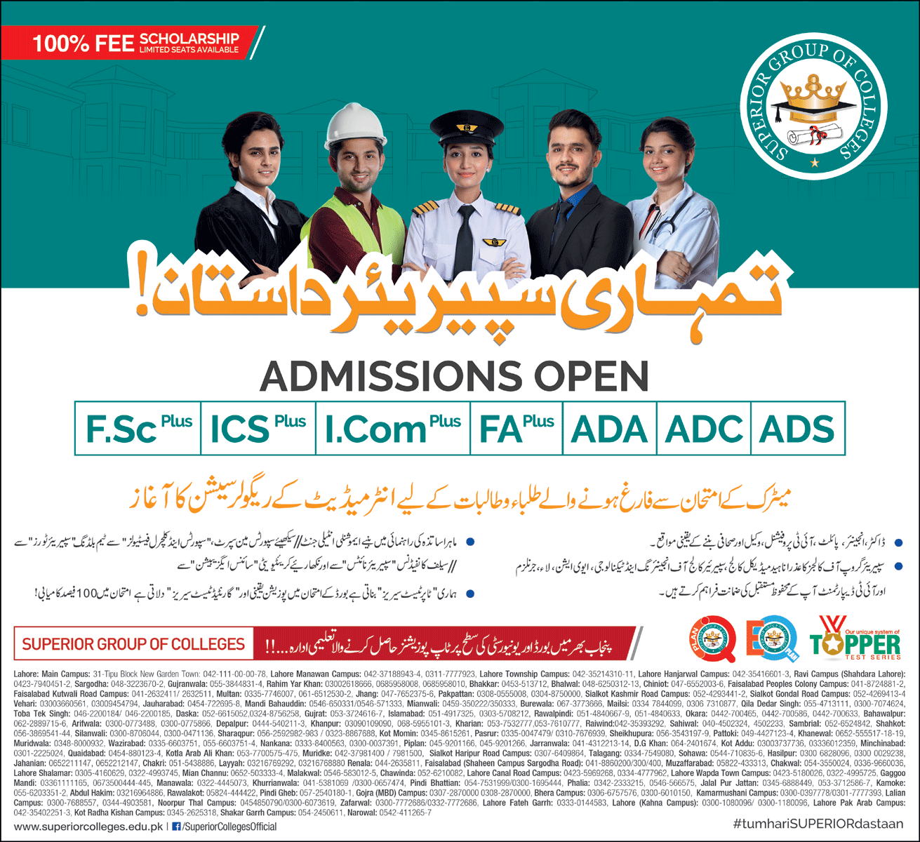 Superior Group of Colleges invites applications for admissions in Intermediate, FSc, ICS, I-Com, FA, ADA, ADC, ADS programs in Lahore Punjab Pakistan 2021. Read newspaper ad for exact details.