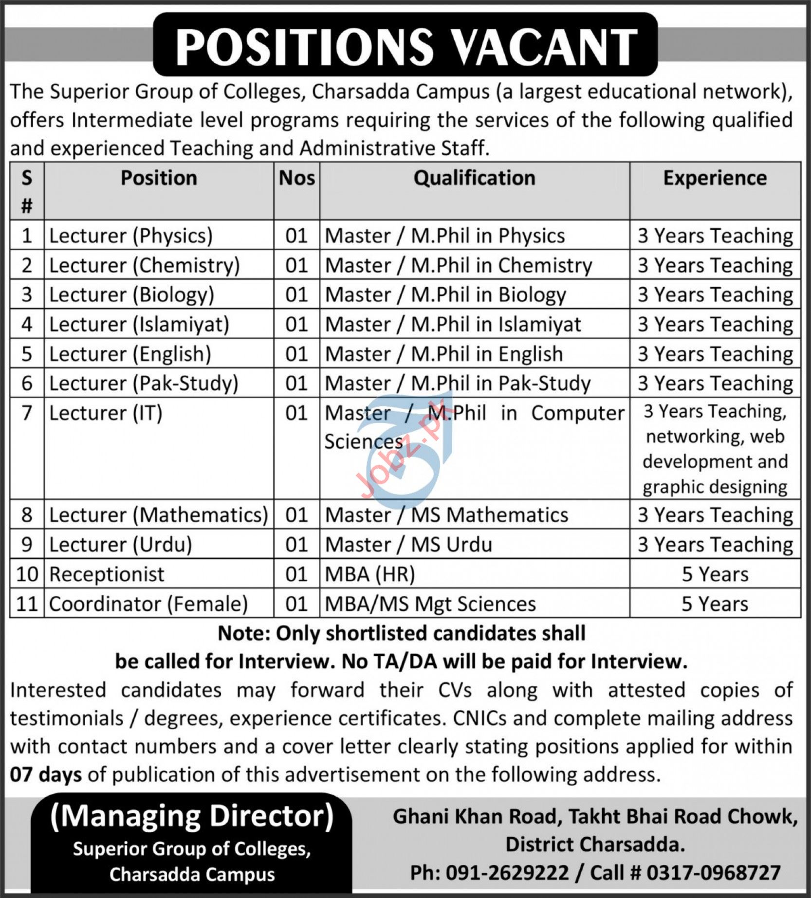 Superior Group of Colleges Charsadda Campus, Pakistan is seeking candidates for the posts of Lecturer, Lecturer Physics, Lecturer Chemistry, Lecturer Biology, Lecturer Islamiyat, Lecturer English, Lecturer Pak Study, Lecturer IT, Lecturer Mathematics, Lecturer Urdu, Receptionist, Coordinator, Female Coordinator.