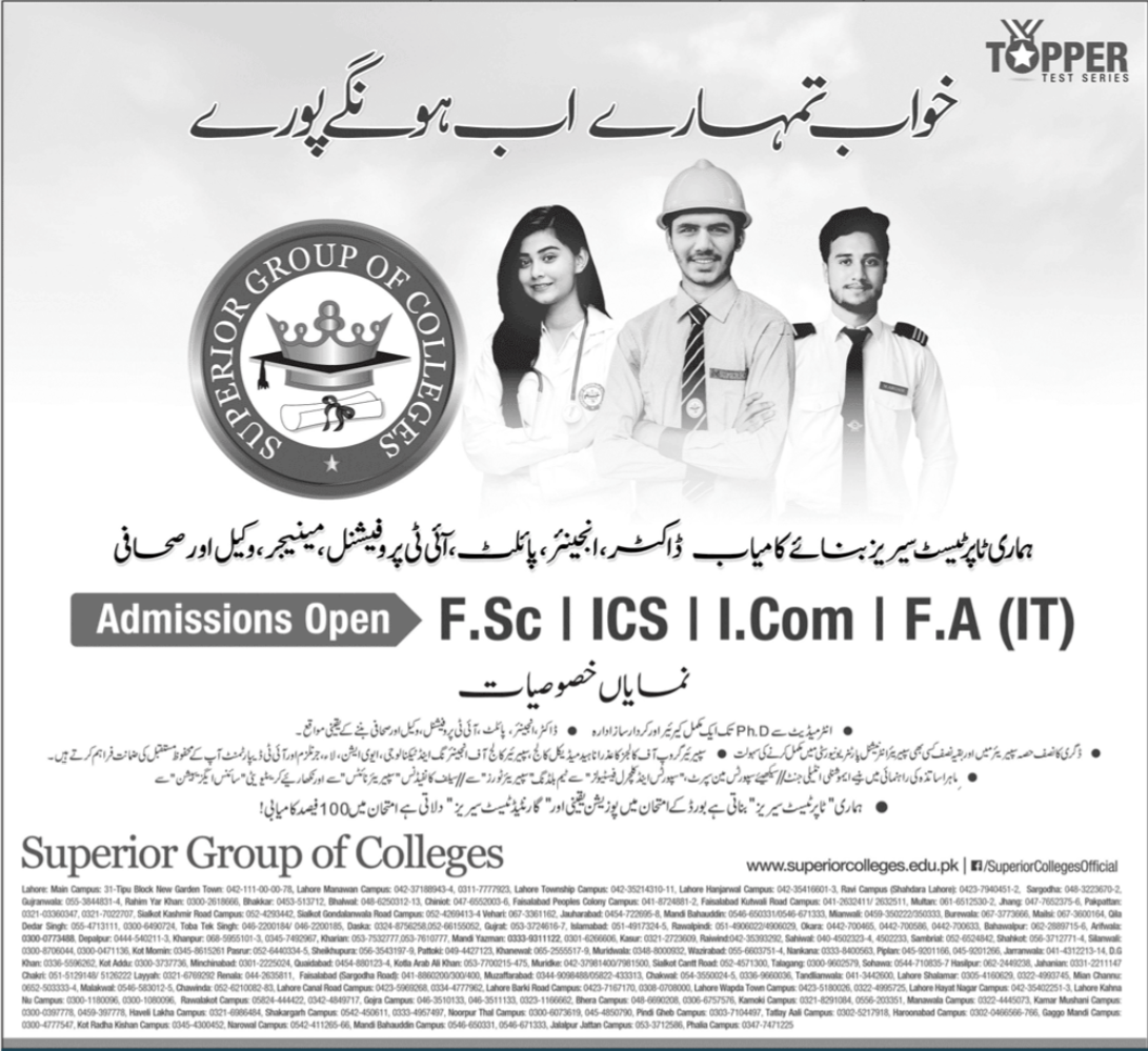 Superior Group of Colleges has announced admissions in Intermediate, FSc Pre Engineering, FSc Pre Medical, ICS Computer Science, I-Com Commerce and FA IT Information Technology. Read newspaper ad for exact details.