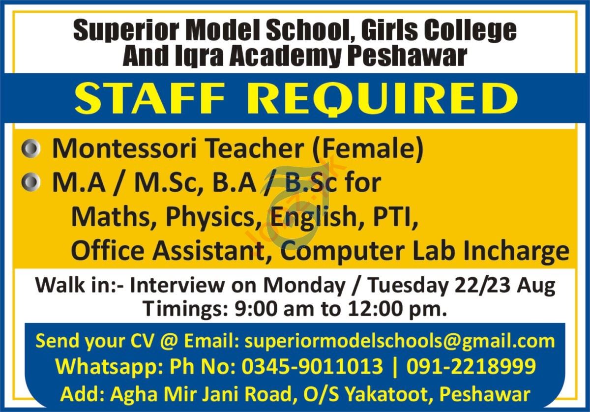 Vacant posts including english teacher, office assistant, math teacher, montessori teacher, physical training instructor, pti, computer lab incharge, teacher and physics teacher are announced in Superior Model School & College Iqra Academy Peshawar, peshawar Khyber Pakhtunkhwa KPK Pakistan as per 21 August 2022 advertisement in daily Aaj Newspaper. MS, Phd, Bachelor, Mphil and Master etc. educational qualification will be preferred.