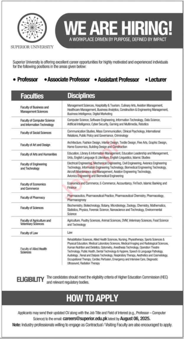 Latest Teaching jobs and others Private jobs in Superior University closing date is around August 6, 2025, see exact from ad. Read complete ad online to know how to apply on latest Superior University job opportunities.