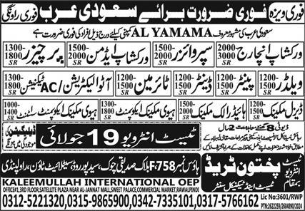 Kaleem Ullah International Overseas Employment Promoter jobs advertisement dated about 12 July 2024 in daily Express Newspaper invites application for the vacant post of heavy equipment mechanic, auto electrician, heavy mechanic equipment assistant, diesel mechanic, ac technician, welder, supervisor, workshop incharge, painter, workshop admin, hydraulic mechanic, purchaser, denter and tire man in Riyadh, riyadh Saudi Arabia. Persons with Matric, Bachelor, Intermediate and Middle etc. education can apply.