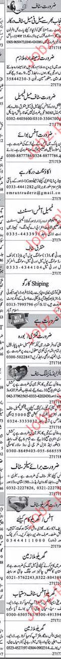 Supervisor,Assistant Clerk,Accountant, Telephone Operator, Receptionist, Computer Operator, Clerk Coordinator, Marketing staff, Office Boy and Other staff required for private company in Faisalabad. Residence, Food, Medical and Other facilities will be given to selected candidates.