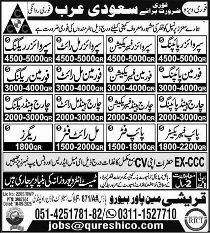 Qureshi Manpower Bureau jobs advertisement dated about 14 September 2025 in daily Express Newspaper invites application for the vacant post of pipe fabricator, pipe fitter, chargehand, foreman, millwright fitter, rigger and supervisor in Riyadh, riyadh Saudi Arabia. Middle, Intermediate and Matric etc. educational qualification will be preferred.