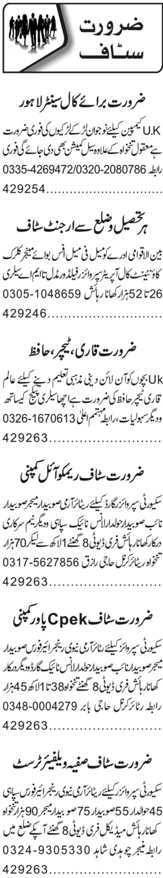 Private Multan, lahore and multan Punjab Pakistan invites applications from eligible candidates for the post of retired naib subedar, retired lance naik, hafiz, security supervisor, retired person, retired sepoy, supervisor, retired subedar major, qari, field worker, retired havaldar, call operator, call center staff, teacher, retired subedar, office boy, accountant, manager, security guard and clerk as per advertisement of November 2, 2023 published in daily Roznama 92 News Newspaper. Preferred Education is Bachelor, Middle, Intermediate, Master and Matric etc.