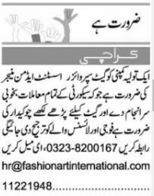 Towel Manufacturing Company jobs advertisement dated about 11 June 2022 in daily Express Newspaper invites application for the vacant post of assistant admin manager and supervisor in Karachi, karachi Sindh Pakistan. Educational qualifications required Bachelor and Intermediate etc.