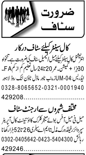 Private Company jobs advertisement dated about 27 January 2024 in daily Roznama 92 News Newspaper invites application for the vacant post of call center staff, field worker, call center agent, call operator, clerk, office boy, supervisor, accountant and manager in Lahore, lahore Punjab Pakistan. Educational qualifications required Bachelor, Middle, Matric, BA, Intermediate, I.com and B.com etc.