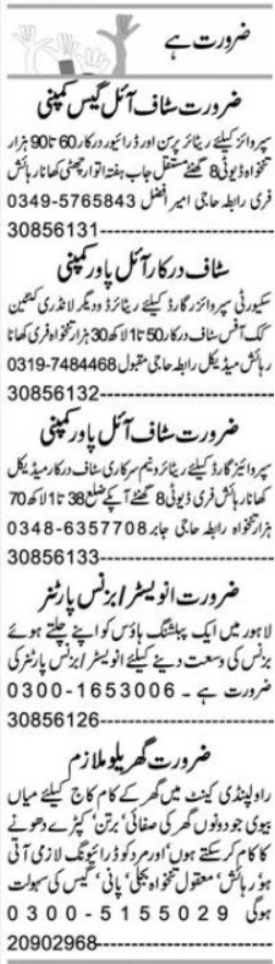 Private Company latest Classifieds Human Resource jobs and others can be applied till August 26, 2023 or as per closing date in newspaper ad. Read complete ad online to know how to apply on latest Private Company job opportunities. Housework, House Cleaning, Security, Cooking and Driving skills may beneficial for these Private Company jobs. Free accommodation, medical and food may be available.