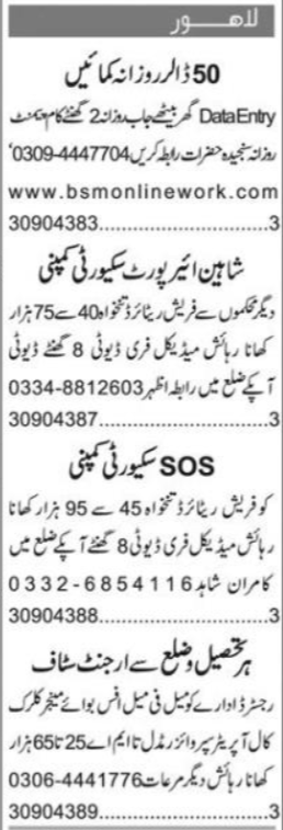 Private Company Lahore, lahore Punjab Pakistan invites applications from eligible candidates for the post of call operator, security guard, office boy, manager, supervisor, clerk, security staff and data entry operator as per advertisement of December 26, 2024 published in daily Express Newspaper. Candidates with BA, Bachelor, Middle, Matric and Intermediate etc. educational background will be preferred.