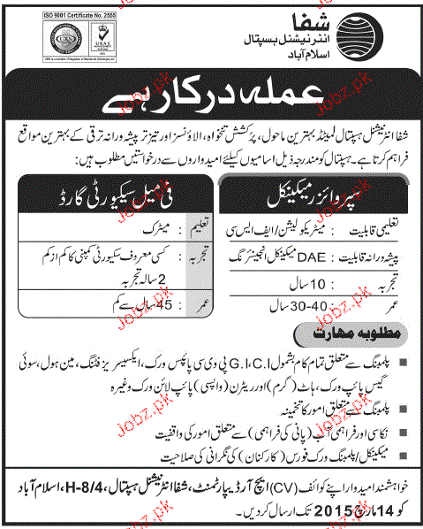 Supervisor Mechanical and Female Security Guards are required in Shifa International Hospital in Islamabad.