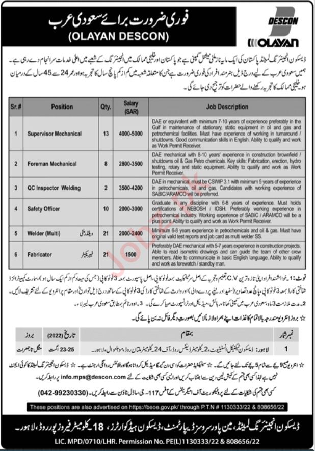 Descon Engineering Limited Riyadh, riyadh Saudi Arabia invites applications from eligible candidates for the post of fabricator, foreman mechanical, safety officer, multi welder, supervisor mechanical and qc inspector welding as per advertisement of August 21, 2022 published in daily Jang Newspaper. Persons with DAE and Others etc. education can apply.
